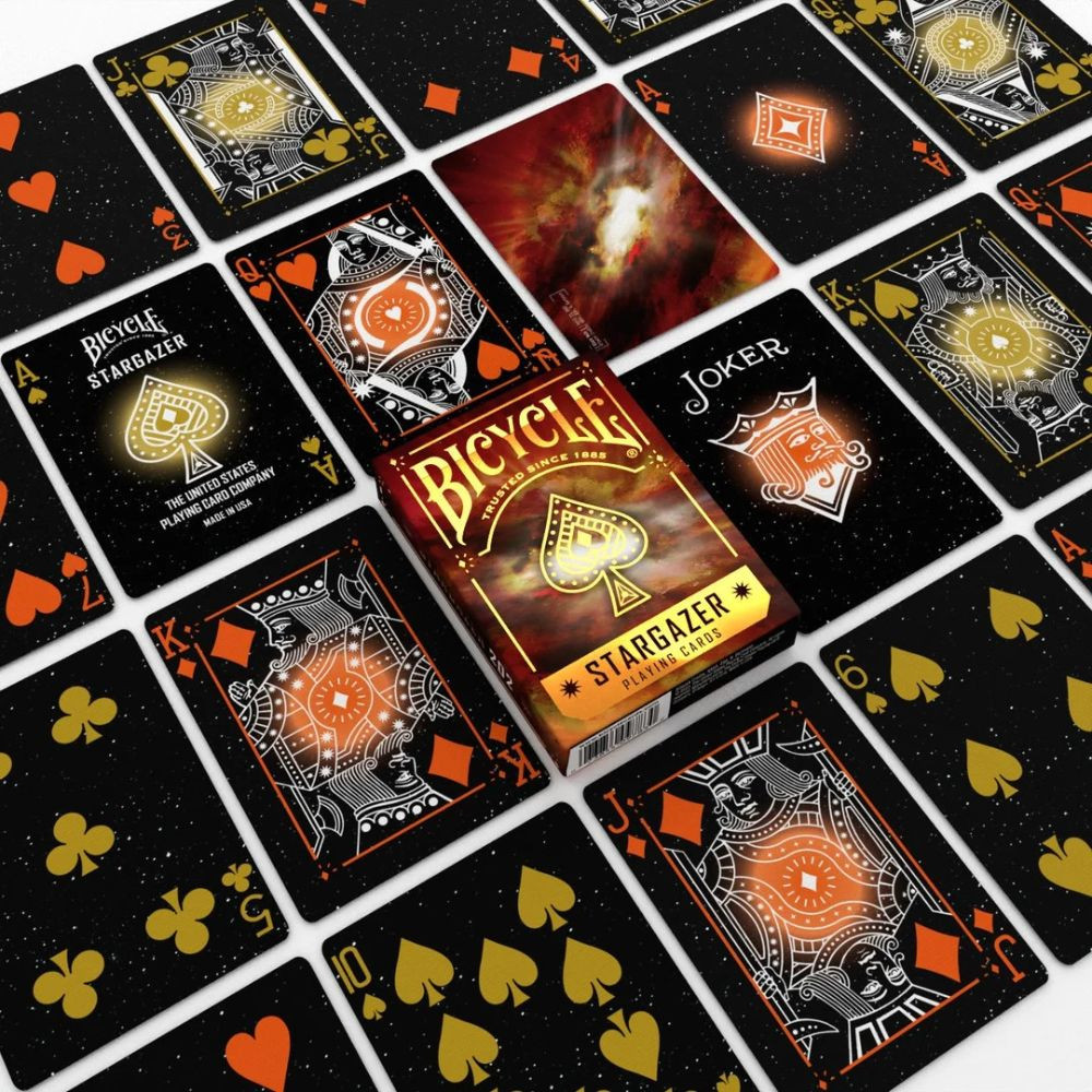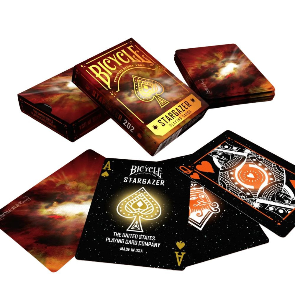 A csillagok sosem alszanak – most te is a fényükben játszhatsz a Bicycle Stargazer 202 francia kártya segítségével. Ez a pakli a kozmosz forró szívét hozza el az asztalodra: a napkitörések ragyogása és a sötét égbolt mélysége találkozik benne. A dizájn fekete alapon aranyló és narancsos árnyalatokat használ, amelyek a csillagok fényét egyensúlyozzák. A hátlapokon finom galaktikus minták és pontszerű csillagok ragyognak, a figurális lapok fénylő kontúrjai pedig elegáns, szinte hipnotikus hatást keltenek. A Bicycle prémium minősége gondoskodik róla, hogy a látvány mellé tökéletes játékélmény is társuljon: légpárnás bevonat, hajlékony, mégis tartós kártyalapok és precíz nyomtatás biztosítja, hogy minden keverés simán és stílusosan történjen. Fedezd fel a Bicycle Stargazer 202 paklit, és hagyd, hogy a csillagok tüze vezesse a játékodat! Ez egy elragadóan különleges kártya azoknak, akik szeretik, ha a játékban is ott izzik az univerzum ereje.