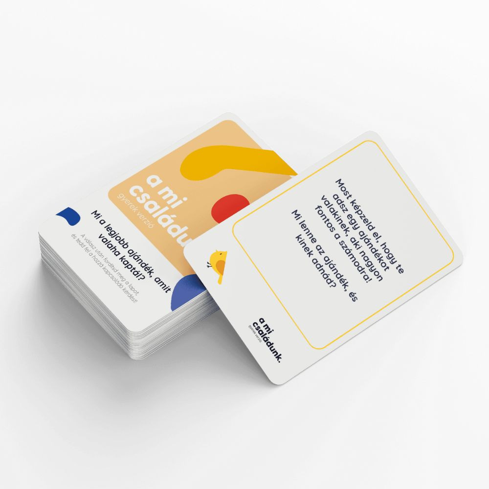 A Mi családunk – gyerek verzió egy vidám és szeretetteljes játék, ami összehozza a családot. Könnyed kérdések, vicces feladatok és sok-sok nevetés vár mindenkire – kicsiktől a nagyokig. Ideális közös program hétvégére, utazásra vagy vacsora utáni beszélgetésekhez. Egy játék, ami nemcsak szórakoztat, hanem közelebb is hoz egymáshoz.