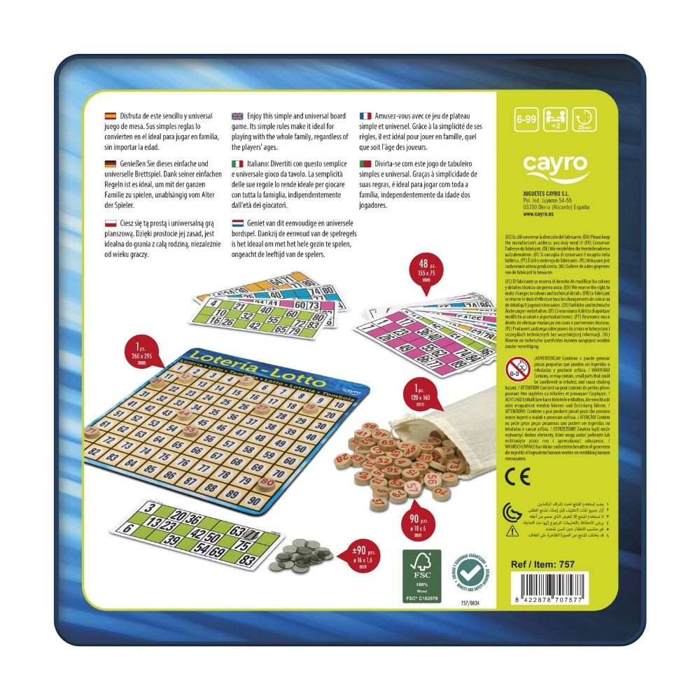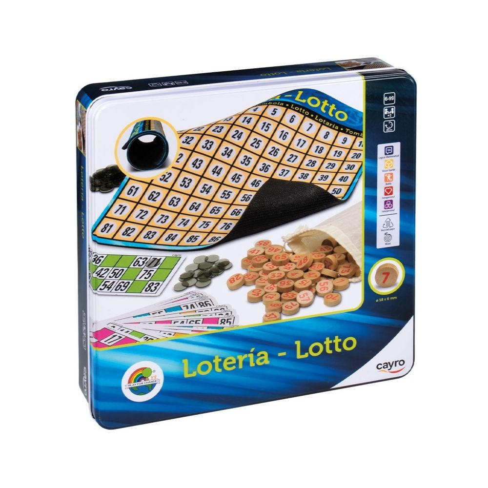 Ez a játék a klasszikus lottó bingó mechanikáját testesíti meg: szórakoztató játék számhúzással, jelöléssel és várakozással. A hangulat feszült izgatottság, amikor a kihúzott számot össze kell egyeztetni a saját tábláddal, és minden lépés közelebb vihet a győzelemhez. A játékmenet során egy számhúzó zsákból sorban kerülnek elő a számok, a játékosok pedig az adott számot jelölik a saját tábláikon. Az nyer, aki először teljes sorral, oszloppal vagy mintával lefedi a kihúzott számokat. A játék elemei egyszerűek, de a várakozás, a figyelem és a szerencse kombinációja igazi élménnyé teszi. A játék nyelve angol, de nyelvfüggetlen. Doboz tartalma: