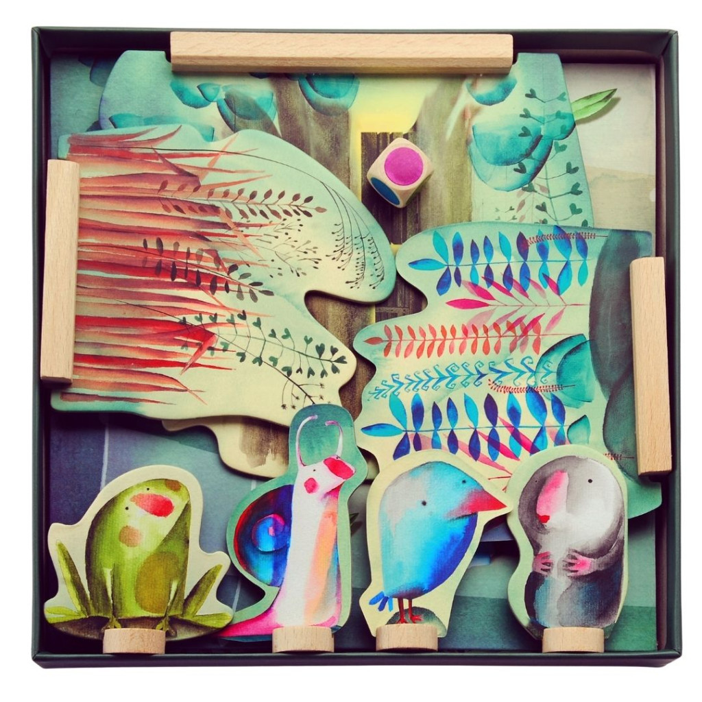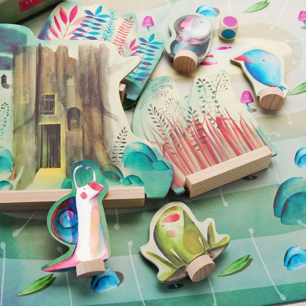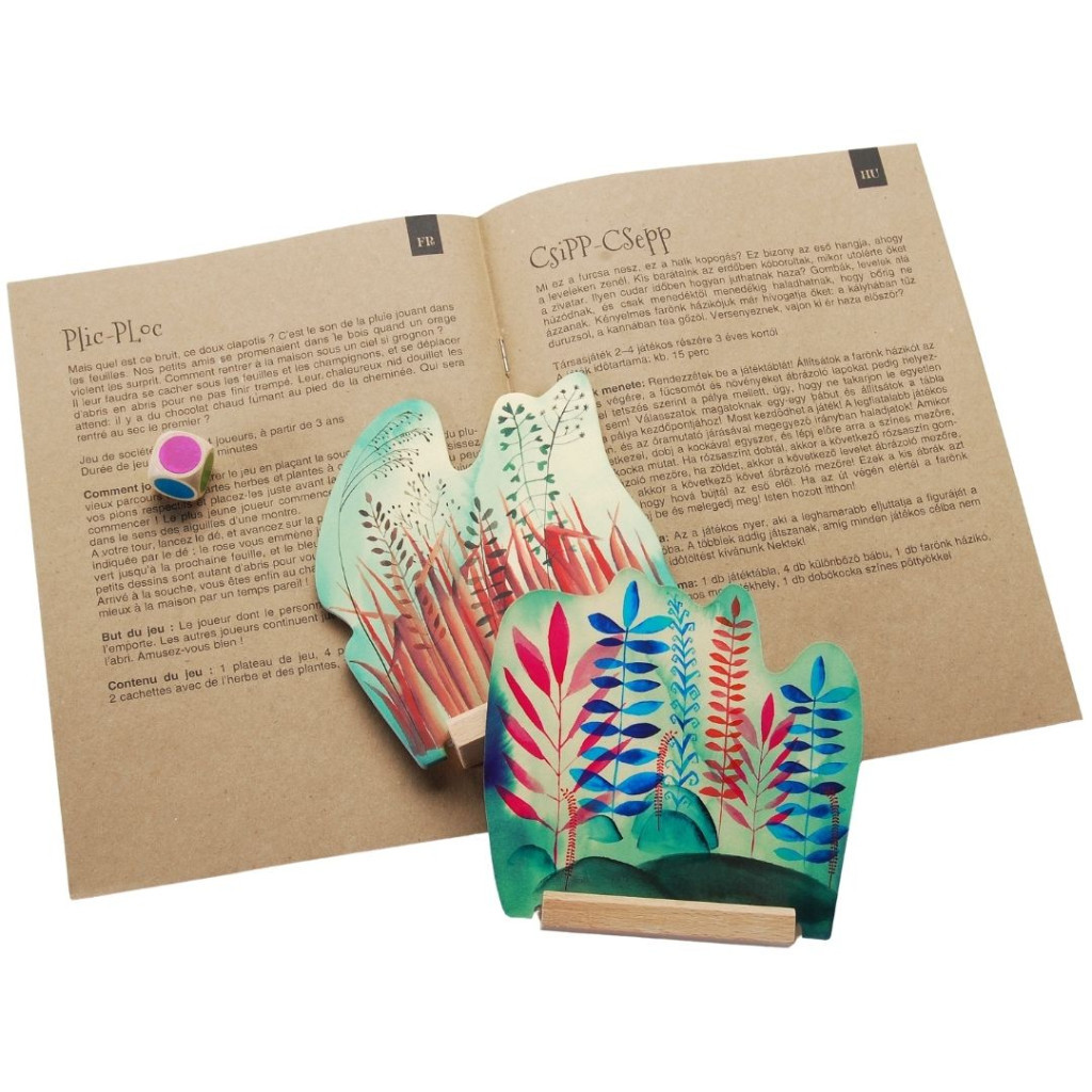 Mi ez a furcsa nesz, ez a halk kopogás? Az eső hangja, ahogy a leveleken zenél, miközben kis barátaink az erdőben kóborolnak. Ha zivatar éri őket, gombák alá húzódnak, menedéktől menedékig, hogy bőrig ne ázzanak. Hogy ki ér haza először a kényelmes farönk házikó melegébe, ahol a kályhában tűz duruzsol, és a kannában tea gőzöl? Hogyan játszd? Állítsátok a farönk házikót az út végére, míg a füves-virágos lapokat tetszés szerint helyezzétek el. Válasszatok bábut és induljatok! A legfiatalabb kezd, és az óramutató járásával megegyező irányban haladjatok! Dobj a színes kockával, és lépj a megfelelő mezőre, ami elrejti az eső elől. Ha elérsz a házhoz, megérkeztél!
