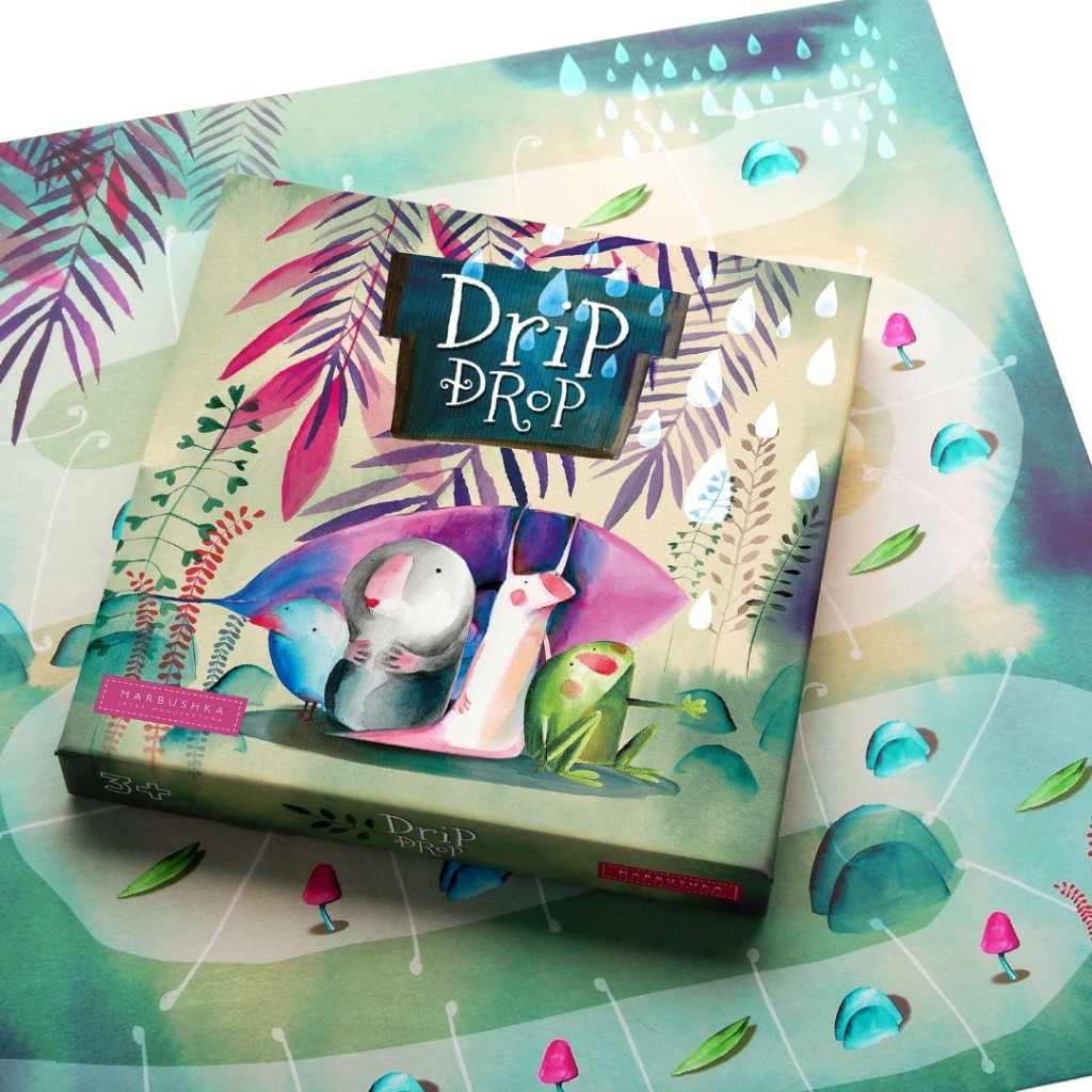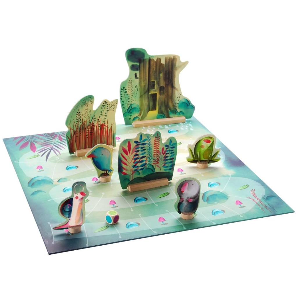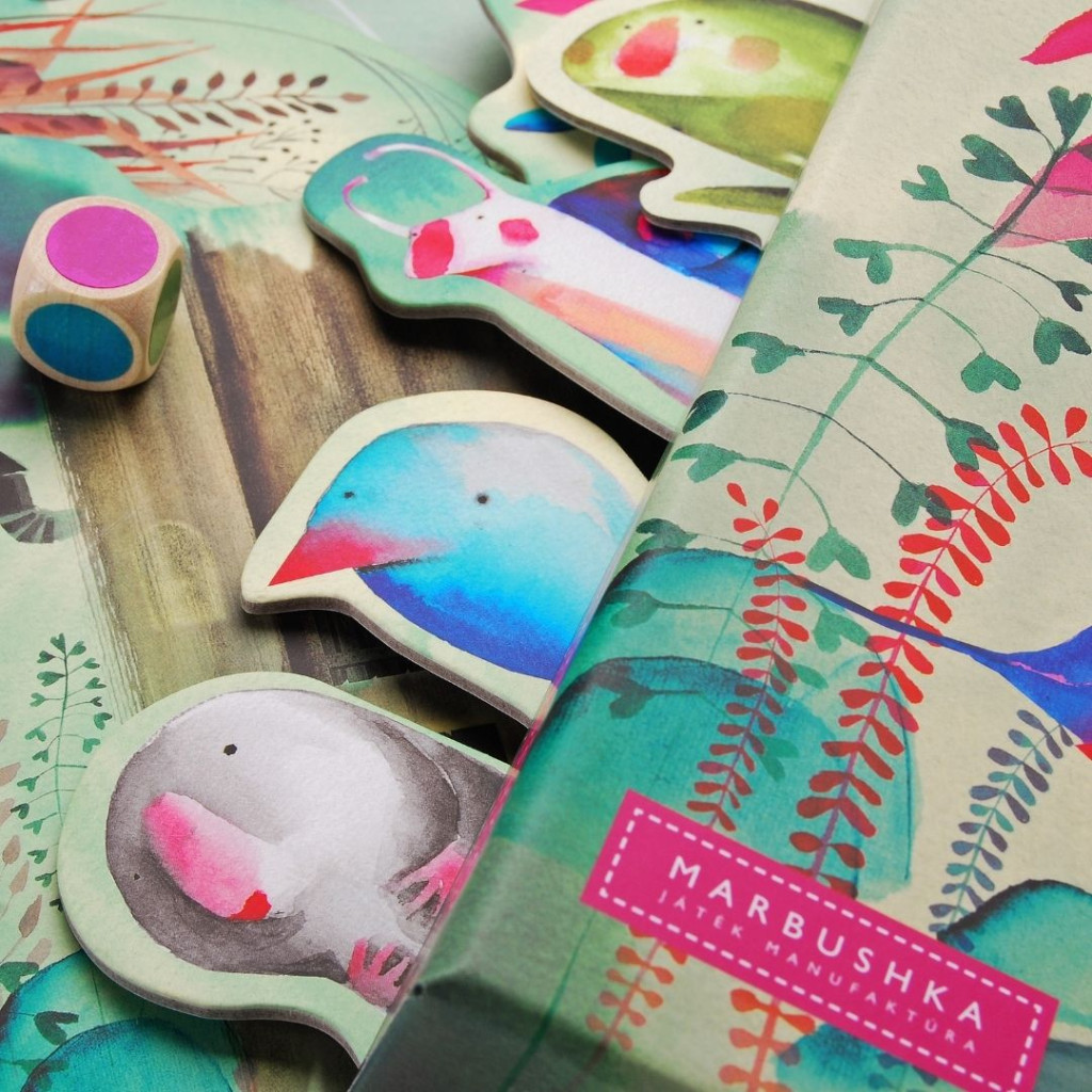 Mi ez a furcsa nesz, ez a halk kopogás? Az eső hangja, ahogy a leveleken zenél, miközben kis barátaink az erdőben kóborolnak. Ha zivatar éri őket, gombák alá húzódnak, menedéktől menedékig, hogy bőrig ne ázzanak. Hogy ki ér haza először a kényelmes farönk házikó melegébe, ahol a kályhában tűz duruzsol, és a kannában tea gőzöl? Hogyan játszd? Állítsátok a farönk házikót az út végére, míg a füves-virágos lapokat tetszés szerint helyezzétek el. Válasszatok bábut és induljatok! A legfiatalabb kezd, és az óramutató járásával megegyező irányban haladjatok! Dobj a színes kockával, és lépj a megfelelő mezőre, ami elrejti az eső elől. Ha elérsz a házhoz, megérkeztél!