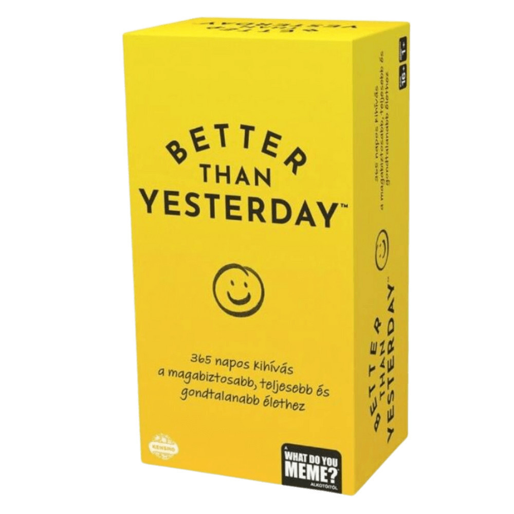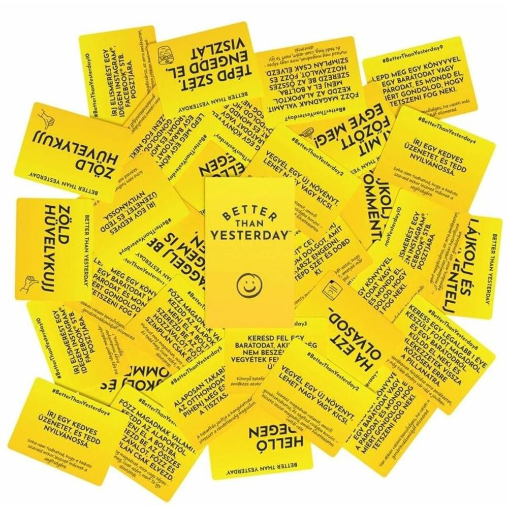 Szeretnéd jobban megismerni önmagad vagy átlépni saját határaidat? Próbáld ki a Better Than Yesterday játékot, mely egész évre 365 napi kihívást kínál neked, hogy segítse személyes fejlődésedet. Kihívások, amelyek a komfortzónádból való kilépésre ösztönöznek - némelyik könnyű, mások pedig komolyabb megpróbáltatást jelentenek. A doboz tartalma: