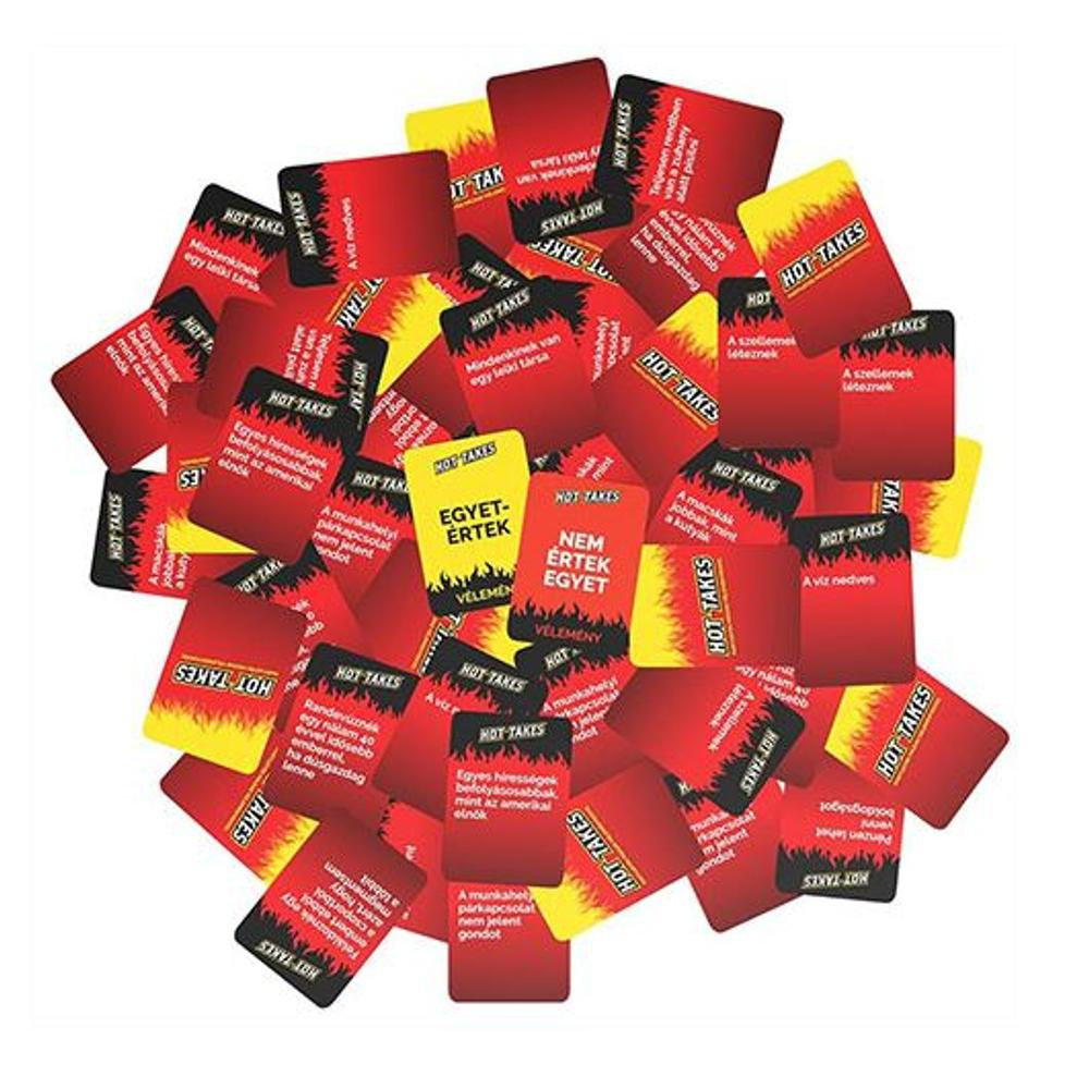 Gondoltál már arra, hogy vajon a barátaiddal azonos-e a véleményetek sokféle kérdésben? A Hot Takes társasjátékkal most kiderítheted! Ebben a pörgős party játékban 300 kérdéskártya vár rád, melyekkel remekül szórakozhatsz. Kérdések, mint például: "A hotdog szendvics?" vagy "Kell-e mindig egy domináns fél egy kapcsolatban?" csak pár példa a sok közül. Minden körben egy új kérdés kerül terítékre, amire a játékosoknak őszintén kell felelniük. Az igazán pikáns vélemények biztosítják a hangulatos beszélgetéseket és meglepő felismeréseket hozhatnak. Nincsenek jó vagy rossz válaszok – csak vélemények, amik megmozgatják a társaságot. Ideális választás 3-8 fő számára, 30-90 percnyi szórakozást nyújtva, 17 éves kor felett. Élvezd az együtt töltött időt a Hot Takes játékával!
