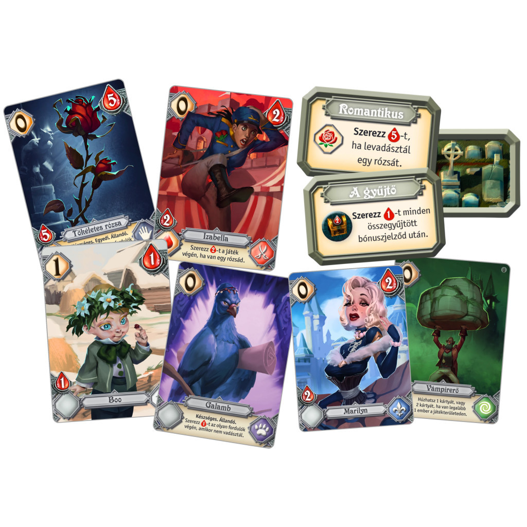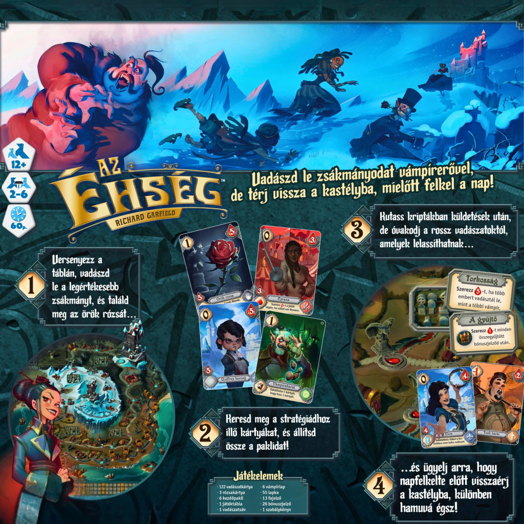 Az éjszaka leple alatt vámpírok indulnak vadászatra, hogy embereket ejtsenek el, küldetéseket teljesítsenek és hírnevet szerezzenek. De vigyázz – a hajnal közeleg, és csak az térhet vissza diadalmasan, aki időben hazaér a kastélyba. Az Éhség egy pörgős pakliépítős versenyjáték, ahol minden döntés számít. Ahogy leszáll az éj, a vámpírok útra kelnek, hogy prédára vadásszanak és megerősödve térjenek vissza a kastélyba hajnal előtt. A feszültség minden körben nő, hiszen a napfelkelte elől csak a leggyorsabb és legokosabb vámpír menekülhet meg. Ebben a pakliépítő társasjátékban a játékosok célja, hogy embereket ejtsenek, küldetéseket teljesítsenek és minél több pontot gyűjtsenek a napkelte előtt. A körök során kártyákat játszol ki, amelyek segítségével mozogsz a térképen, új lapokat szerzel, és különleges képességeket aktiválsz. Azonban a túl sok ember lelassíthat, így meg kell találnod az egyensúlyt a vadászat és a biztonságos hazatérés között. A játék gyors üteme és a versengés minden partit izgalmassá tesz, miközben folyamatosan változik a stratégia az ellenfelek döntéseitől függően. A játék nyelve: magyar.