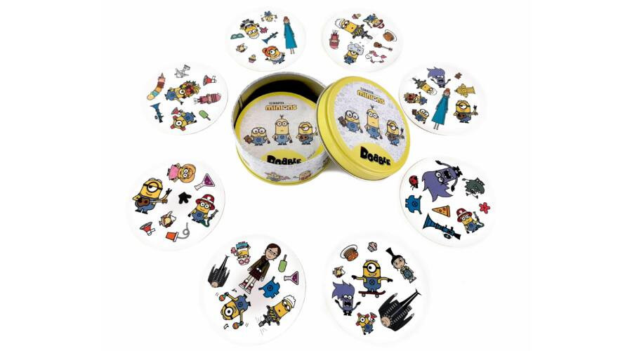 Kit szeretsz jobban? Kevint, Stuartot, esetleg Bobot? Most a Dobble játékkal még inkább elszórakozhatsz velük! Készen állsz a kihívásra? A Dobble Minyonok egy pörgős játék, amit könnyen zsebre vághatsz, és tökéletes utazáshoz is. A játék öt különböző változatot kínál, melyek során a koncentráció és a reflexek is fejlődnek. A kártyákon 8 különböző kép található, és bármelyik két kártyán van egy azonos. A játékosok célja, hogy gyorsabban találják meg a közös képeket, mint a többiek.