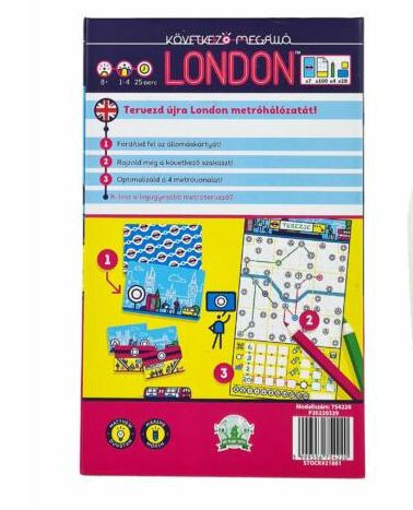 Ki lesz a legjobb metrómenedzser? A célod az, hogy minél több pontot szerezz, optimalizálva a négy metróvonal útvonalát London térképén. Játssz négy fordulón keresztül, miközben az ideális metró megalkotásán dolgozol, ügyelve arra, hogy a lehető legtöbbet hozzátok ki a csatlakozási pontokból! Az a játékos nyer, akinek a végén a legtöbb pontja van. Ha már játszottál néhányszor, átmehetsz a haladó modulra, amely több játéklehetőséget és keményebb kihívásokat kínál. A Következő megálló London szólóban is játszható!