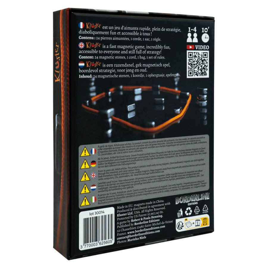 Éld át a Kluster mágneses játék izgalmait és vidám pillanatait! A játék célja egyszerű: szabadulj meg a mágnesektől, de vigyázz, nehogy egymáshoz tapadjanak! Osszátok el a mágneseket egyenlően, és kezdődhet a móka! A játékosoknak ügyesen kell elhelyezniük a mágneseket egy madzagra úgy, hogy azok közel kerüljenek, de ne tapadjanak össze. Ha nincs társaság, próbálkozz egyedül rekord időért.