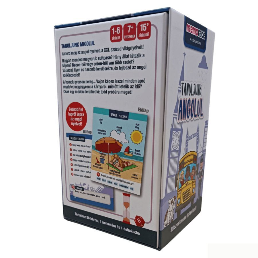 Ismerd meg az angol nyelvet, a XXI. század világnyelvét! Válaszolj kérdésekre, mint például hogyan mondod magyarul azt, hogy 'suitcase', hány állat látszik a képen, vagy baconből vagy hagymából van több szelet? Fejleszd az angol szókincsedet és próbáld megjegyezni minden apró részletet a kártyáról, mielőtt letelik az idő!