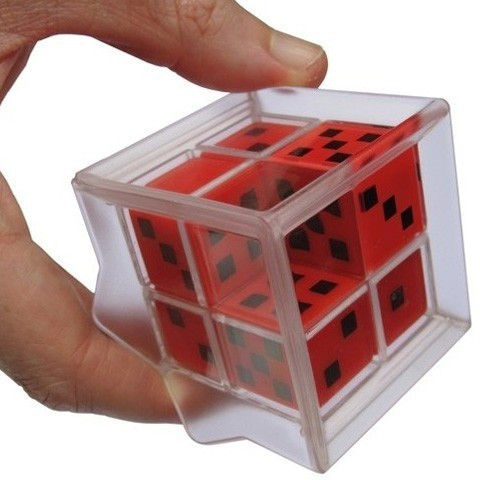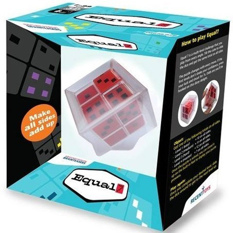 Az Equal 7 egy különleges logikai játék, ami több nehézségi szinten is játszható. A játék egy átlátszó műanyagkockából áll, amelyben hét egyforma számozott kocka került, így éppen van egy kockányi hely, hogy forgatással folyamatosan tudjuk változtatni a kis kockák helyzetét. A feladat, hogy addig variáljunk a kis kockákkal, míg minden oldalon ugyanannyi pöttyöt számolhatunk össze. Az első szinten tíz, majd tizenegy, aztán tizenkét, és végül a legnehezebb változatban hét pöttyöt kell minden oldalra ügyeskednünk.