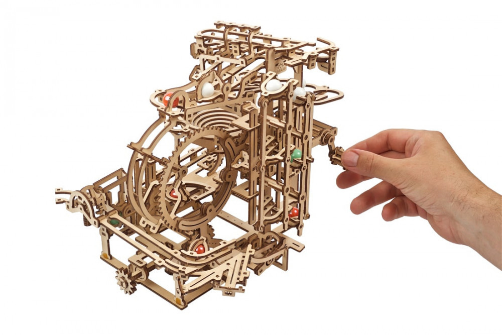 A modell 3 fokozatú váltakozó felvonóval rendelkezik, amely előre-hátra adja az üveggolyókat, miközben azok felkapaszkodnak a tetejére, hogy megkezdjék vidámparki kalandjaikat. Melyik golyó melyik pályára kerül, és melyik jut le először? A Marble Run lépcsős emelő egy 3 golyós akkumulátort tartalmaz, amelyben a harmadik golyó kinyitja a csapdába esett első és második golyó kapuját, és mindhármat elindítja az eltérő pályán. Három pálya van: az első egy 2 golyóból álló akkumulátort és szerpentinpályát tartalmaz, a második egy C alakú bölcsőben lévő kalapácshinta, a harmadik pedig egy örvény vagy tölcsér. Minden golyó végül átmegy a gyűjtőtálcán és a hintalemelőbe kerül. Egy billenőkapcsoló mechanizmus vagy visszaküldi a golyókat a visszatérő pályán a 3 lépcsős felvonóba, vagy (és itt válik igazán izgalmassá!) egy másik csatlakoztatott Ugears golyópályára.