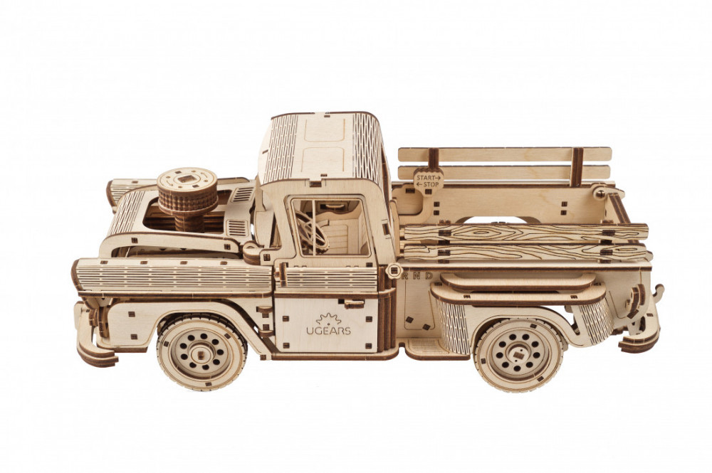 A Pickup Lumberjack 3 üzemmóddal rendelkezik: R (hátramenet), N (semleges), D (előre). A rugó energiája egy fogaskerék-készletbe kerül, hogy növelje a sebességfokozatot, a sebességváltón keresztül, majd a hajtótengelyre, a differenciálműre és a hátsó tengelyre. A teherautó platóján található Start/Stop mechanizmus lehetővé teszi a teherautó parancsra történő indítását. Mivel ez az Ugears, és mivel szeretünk azokra az apró, szeszélyes részletekre összpontosítani, amelyek egy modellt kivételessé tesznek, az ülések alatt egy kis inga szimulálja a teherautó erős motorjának rázkódását. A hajlított rétegelt lemez gyönyörű vonalakat és 1950-es évekbeli stílust kölcsönöz a modellnek. A Pickup ajtajai kívülről és belülről is nyílnak, a hátsó ajtó pedig lehajtható. Az első kerekek a kormánykerék segítségével elforgathatók és rögzíthetők a kecses kanyarodáshoz. A Pickup Lumberjack első és hátsó rugós felfüggesztéssel is rendelkezik, hogy ne pattogjon túl sokat az országutakon.